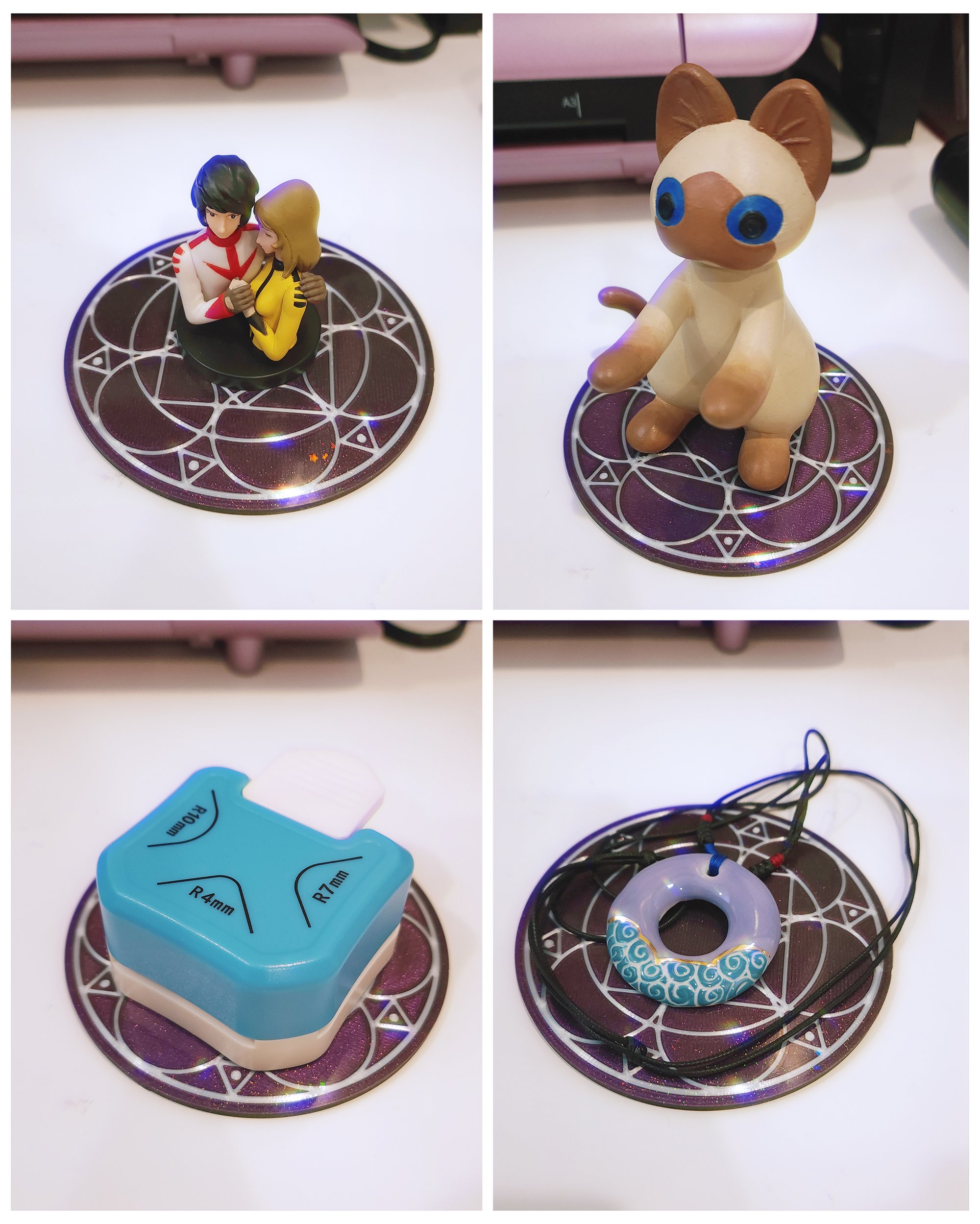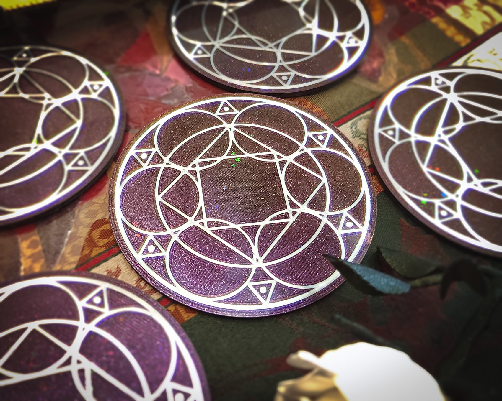 10cm diameter 3D printed ley lines with 4 magnets on the back. Featuring silk white line art + iridescent purple base + holographic starry finish.